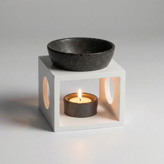 Duftlampe aus weißem Holz in Spa-Optik mit schwarzer Keramikschale