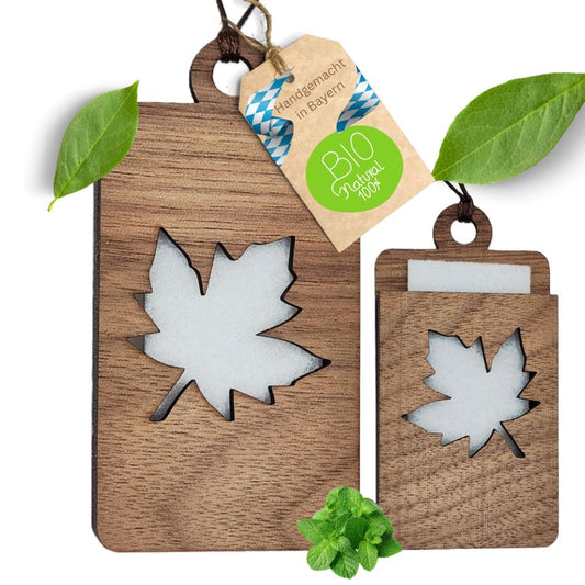 Holz Anhänger für ätherische Öle "AHORNBLATT", Duftbaum aus Nussbaumholz mit Filzpad fürs Auto
