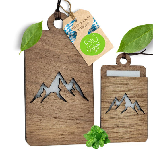 Holz Anhänger für ätherische Öle "BERGE", Duftbaum aus Nussbaumholz mit Filzpad für Duftöle