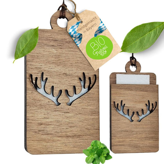 Holz Anhänger für ätherische Öle "GEWEIH", Duftbaum aus Nussbaumholz mit Filzpad fürs Auto