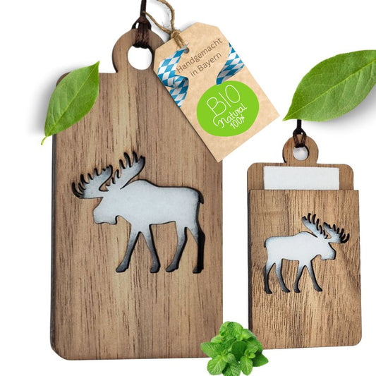 Holz Anhänger für ätherische Öle "HIRSCH", Duftbaum aus Nussbaumholz mit Filzpad fürs Auto