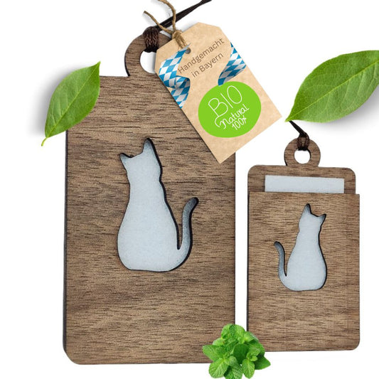 Holz Anhänger für ätherische Öle "KATZE", Duftbaum aus Nussbaumholz mit Filzpad fürs Auto