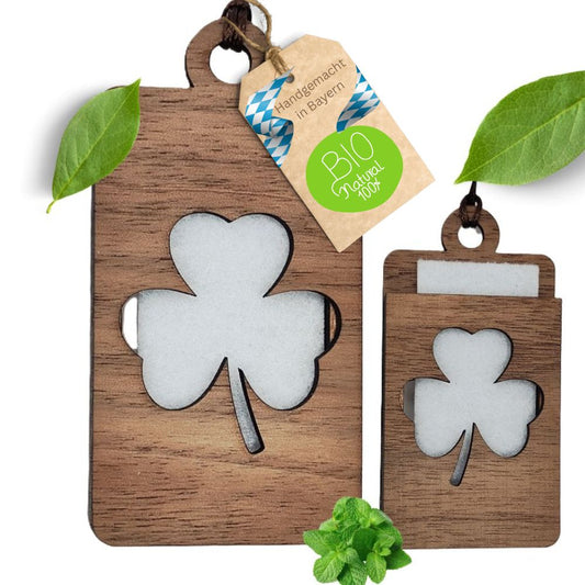 Holz Anhänger für ätherische Öle "KLEEBLATT", Duftbaum aus Nussbaumholz mit Filzpad fürs Auto