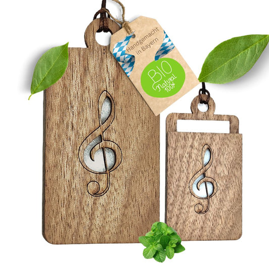 Holz Anhänger für ätherische Öle "NOTENSCHLÜßEL", Duftbaum aus Nussbaumholz mit Filzpad fürs Auto