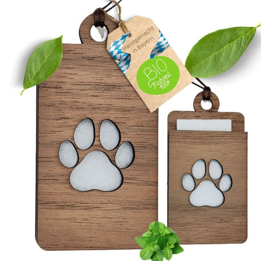 Holz Anhänger für ätherische Öle "PFOTE", Duftbaum aus Nussbaumholz mit Filzpad fürs Auto